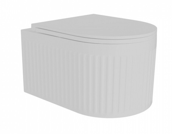 Подвесной унитаз выполненный из фарфора, безободковый, в комплекте с плавноопускающимся сиденьем.
